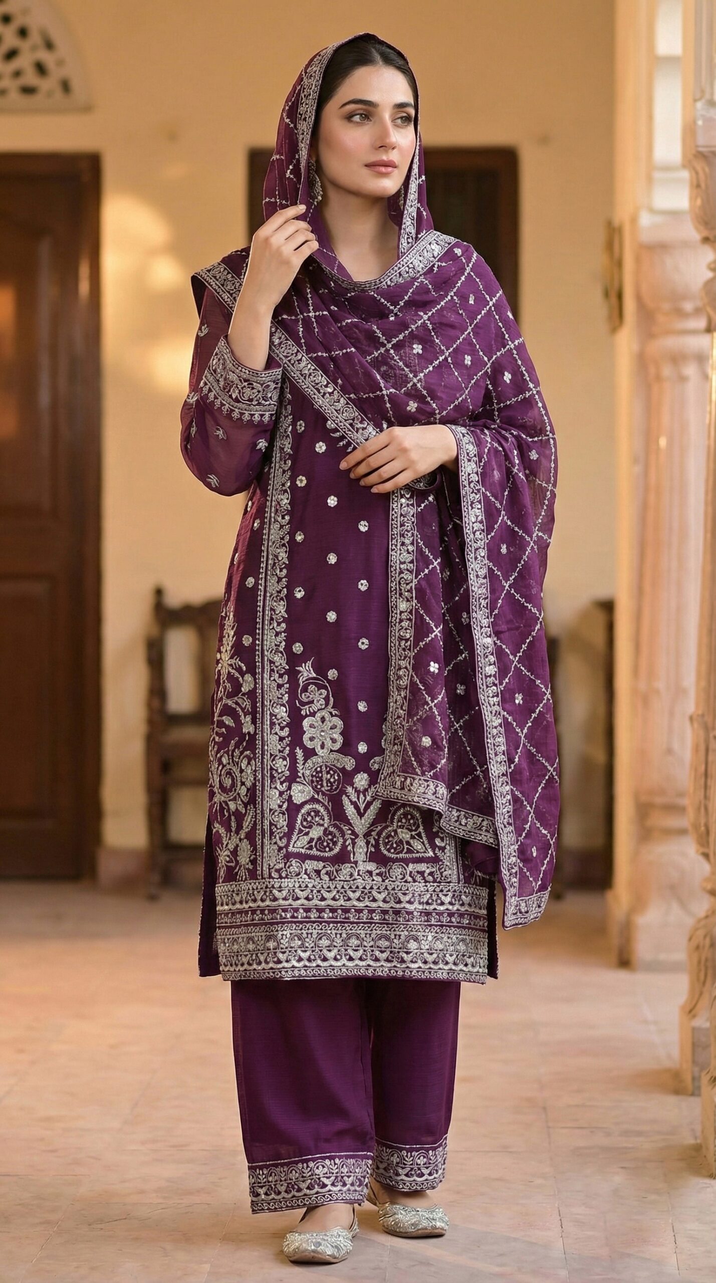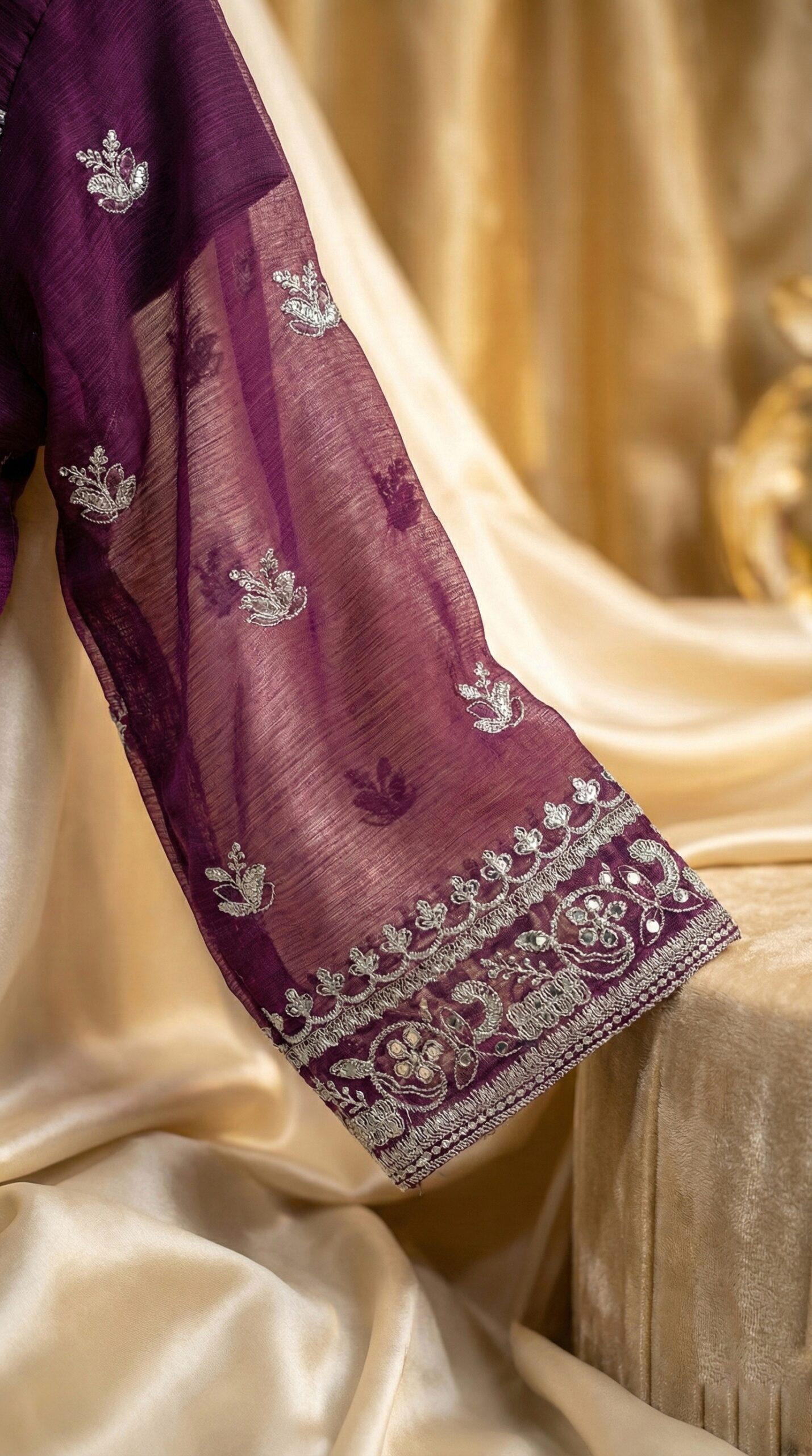 The Top (Kameez): The centerpiece of this outfit is the deep purple shirt, meticulously crafted with heavy silver Zari and sequin work. The neckline features vertical floral embellishments that cascade down to a dense, intricately designed hemline (daman). The full-length sleeves are semi-sheer, finished with a matching heavy embroidered cuff that adds a touch of grace to every movement.
