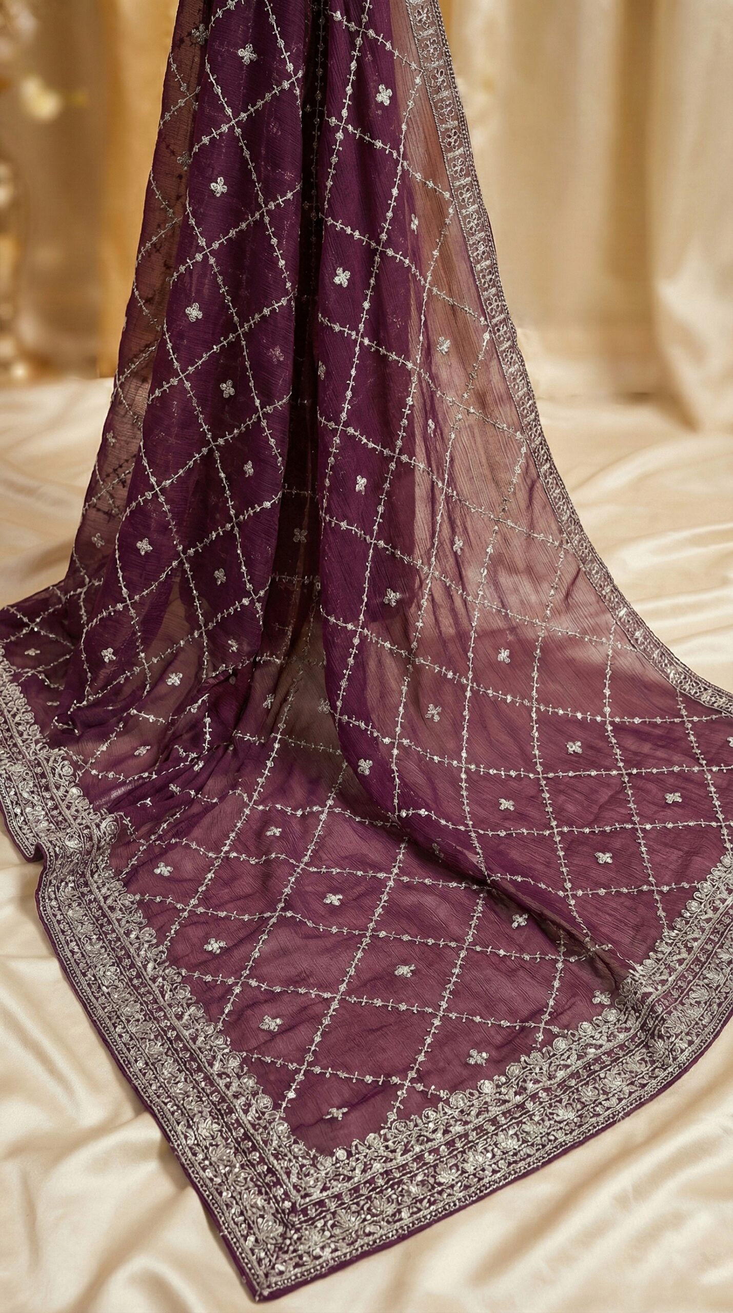 The Dupatta: Completing the look is a lightweight, airy dupatta that exudes elegance. It features a distinctive geometric diamond-grid pattern embroidered in silver all over the fabric, framed by a delicate border that perfectly complements the shirt.