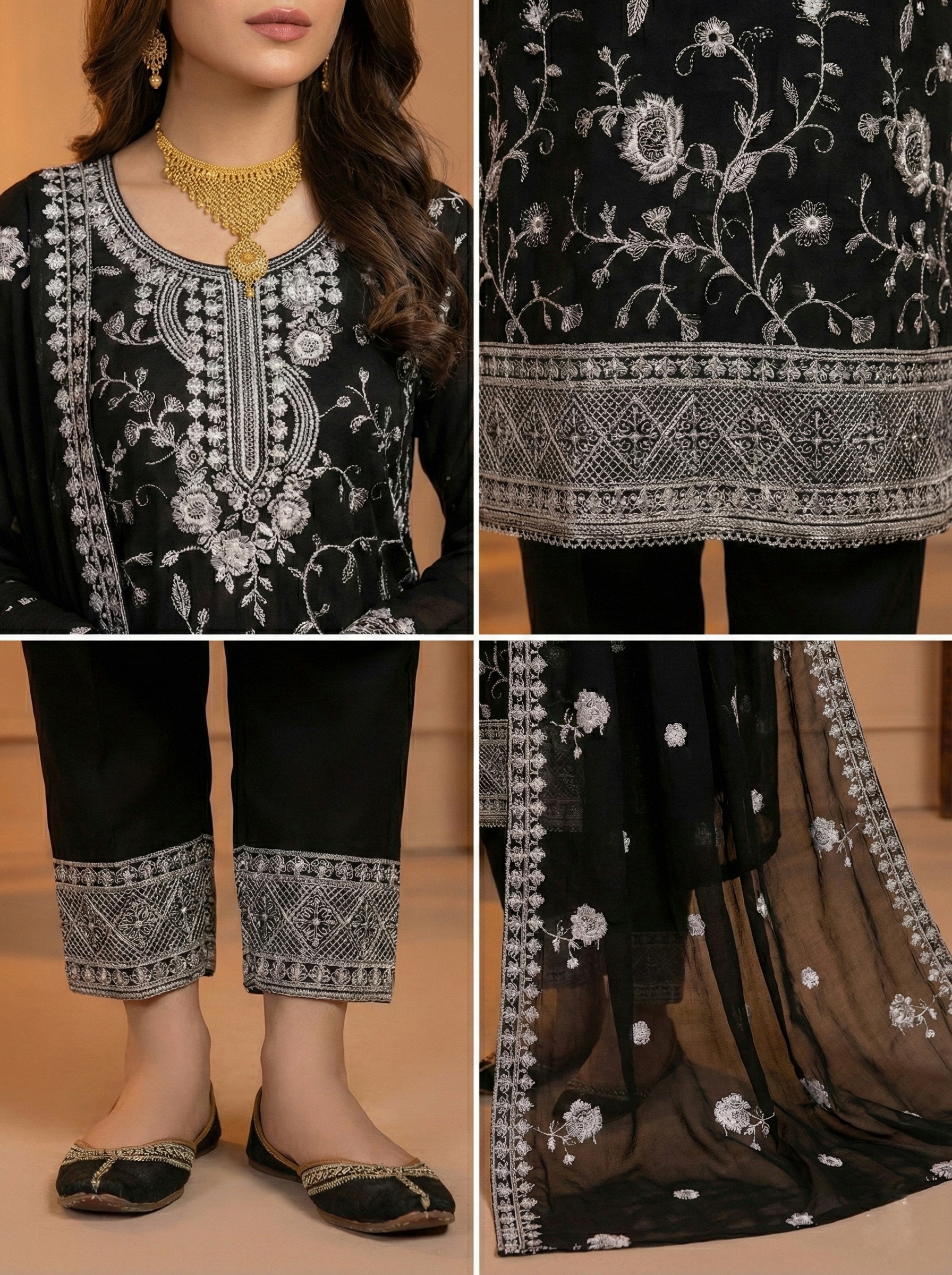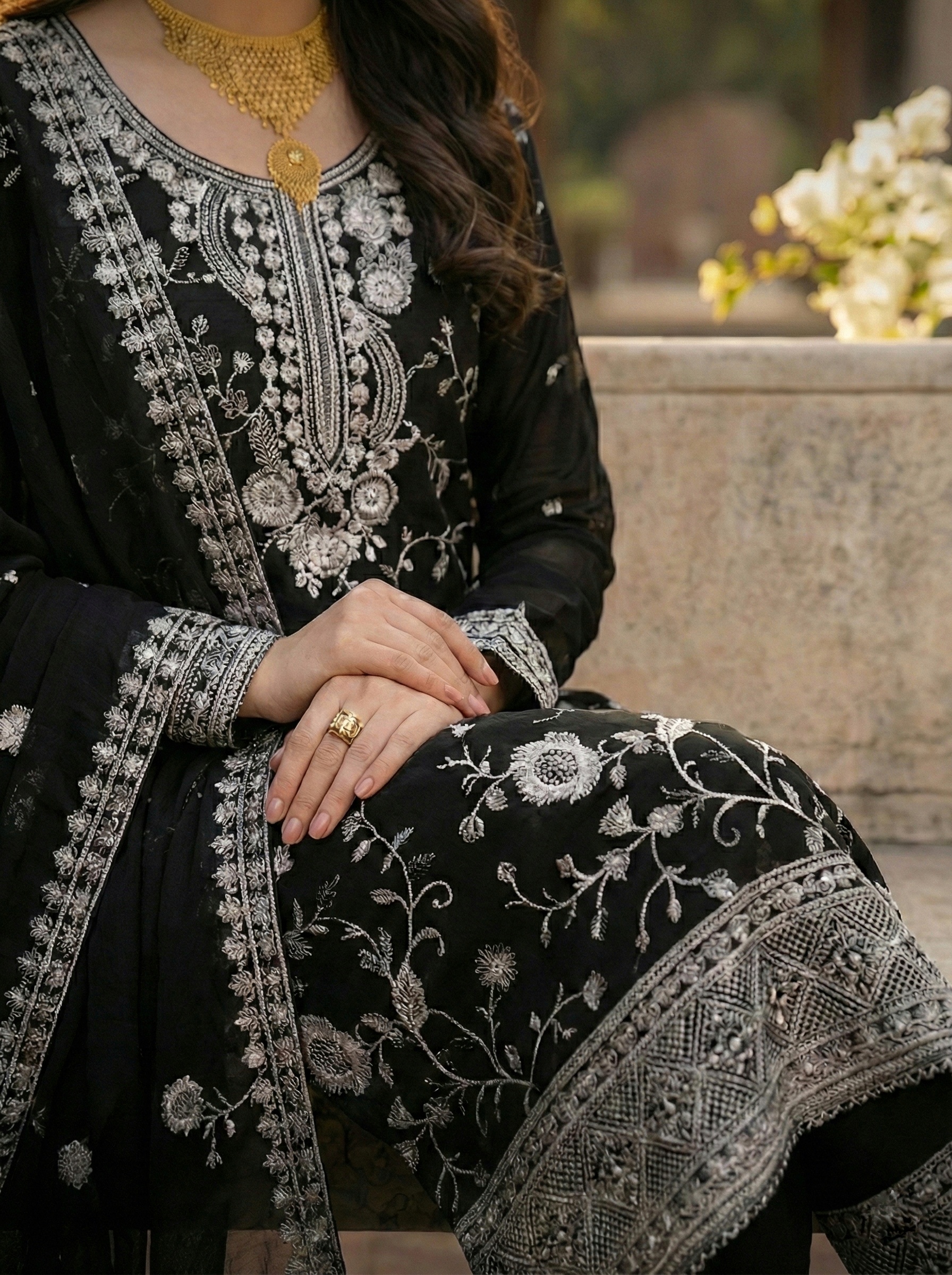 ​The highlight of this outfit is the stunning contrast between the jet-black base and the intricate white floral embroidery. The Kameez features a fully embroidered front with a heavy, detailed border at the hem and distinct floral motifs cascading down the fabric. The neckline is tastefully embellished to frame the face perfectly.