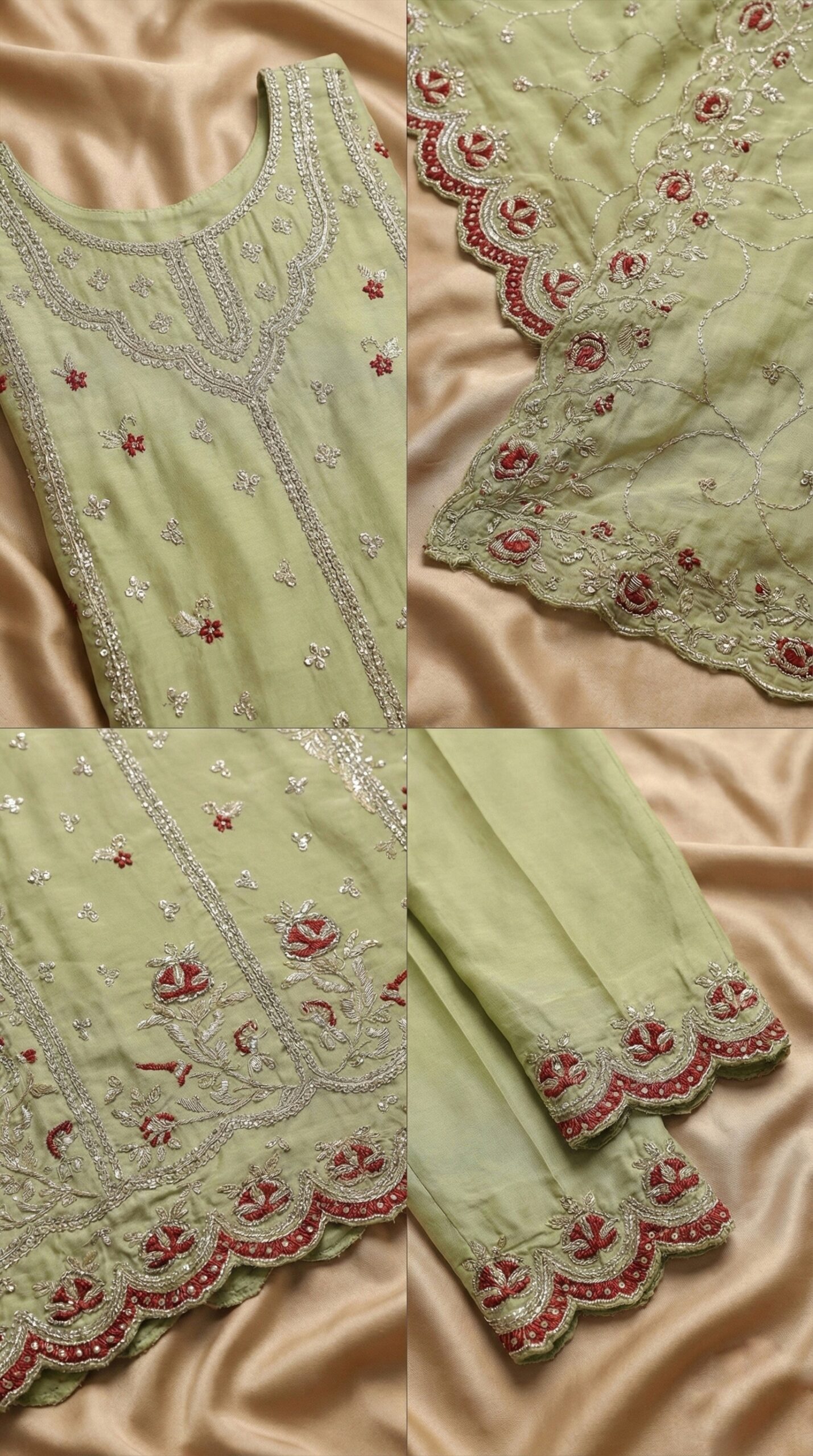 The shirt features a fully embroidered front, adorned with shimmering silver zari lines and sequin work that catches the light from every angle. The design is elevated by contrasting deep maroon floral thread work, adding a pop of color to the soothing green base. The highlight of the outfit is the exquisite scalloped cutwork hemline on both the shirt and the trousers, giving it a boutique, designer finish.