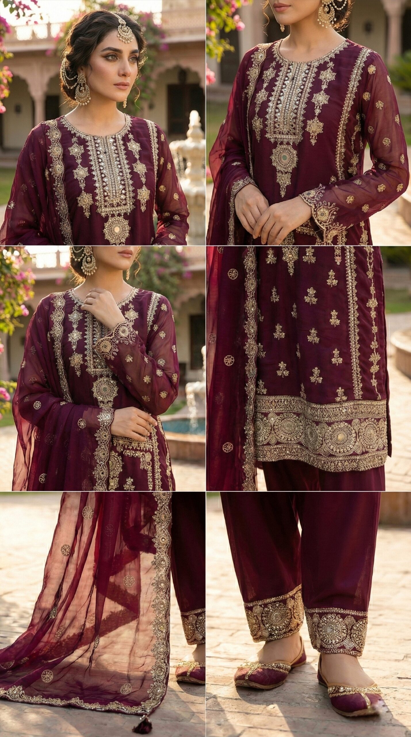 Elevate your ethnic wardrobe with this stunning Deep Maroon Pakistani-Style Three-Piece Suit, designed for those who appreciate regal elegance. This masterpiece combines traditional artistry with modern cuts, making it the perfect choice for weddings, festive gatherings, and evening parties.