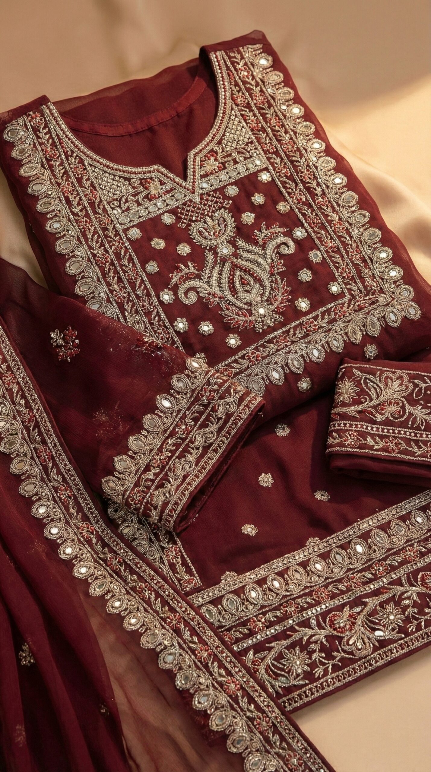 Luxury Maroon Pakistani Style Chiffon Suit with Intricate Silver Zari & Mirror Work Embroidery