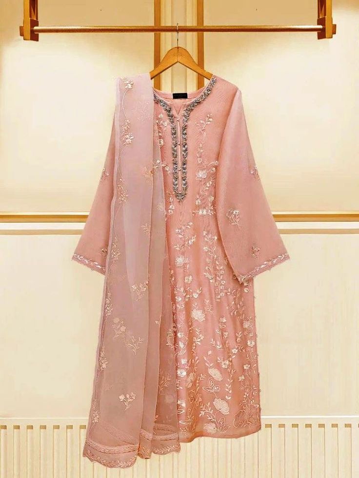 Elegant Peach Organza Embroidered Pakistani Style Three-Piece Suit