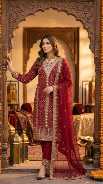 Women’s Magenta Silk Salwar Suit – Full Embroidery & Cutwork Sleeves – 3 Piece Set