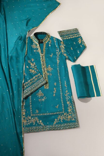 Step into elegance with this masterfully crafted embroidered suit. Designed to offer a regal look, this outfit blends traditional artistry
