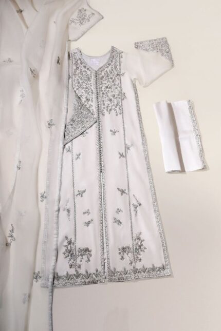 Elegant Design: Stunning lavender (mauve) shade featuring full-body intricate white thread work. Premium Fabric: Crafted from high-quality, flowy fabric (likely Georgette or Chiffon) for a luxurious drape. Complete Set: Includes a heavily embroidered Kameez (top), matching solid Salwar (pants), and a designer embroidered Dupatta. Detailing: Features exquisite floral motifs and a beautiful scalloped cut-work border on the dupatta. Occasion Ready: Perfect for Eid, weddings, parties, and formal gatherings.
